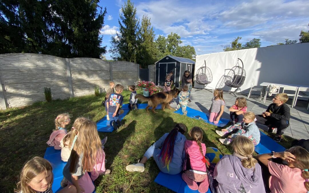 W naszym Centrum odbyły się wyjątkowe zajęcia z udziałem psa, które wzbudziły ogromne zainteresowanie wśród dzieci. Spotkanie rozpoczęło się krótką pogadanką o tym, jak należy dbać o zwierzęta i jak bezpiecznie się z nimi obchodzić, dowiedzieli się, w jaki sposób pies komunikuje swoje potrzeby i jak rozpoznawać jego emocje. Następnie dzieci miały okazję zobaczyć i wypróbować różne komendy – od podstawowych, takich jak „siad” czy „podaj łapę”, aż po bardziej zaawansowane sztuczki. Dużo radości sprawiły również wspólne zabawy, w których pies chętnie uczestniczył, pokazując swoje umiejętności i przyjazne usposobienie. Całe spotkanie było nie tylko świetną zabawą, ale także cenną lekcją odpowiedzialności i empatii wobec zwierząt. Dzieci przekonały się, że pies może być nie tylko wiernym towarzyszem, ale także wspaniałym nauczycielem.